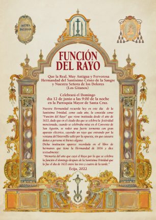 El próximo domingo 12 de Junio a partir de las 21:00h nuestra Hermandad celebra la tradicional función del Rayo. La función del Rayo consiste en la Santa Misa que se ofrece el día de la Santísima Trinidad de cada año, la cual viene impuesta por acuerdo de esta Hermandad desde el año 1625 fecha, en […]