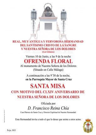 El próximo viernes 10 de junio conmemoraremos el CLXIV aniversario de Nuestra Señora de los Dolores con los siguientes actos: 21:00 – Ofrenda floral y canto de la Salva ante el monumento conmemorativo de Nuestra Señora de los Dolores situado en la C/Málaga. 21:30 – Santa Eucaristía en nuestra Parroquia Mayor de Santa Cruz oficiada […]