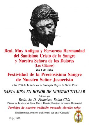 El próximo Viernes día 1 de Julio celebramos la festividad de la Preciosísima Sangre de Nuestro Señor Jesucristo. La Santa Eucaristía en honor de Nuestro Titular el Santísimo Cristo de la Sangre tendrá lugar D.M. a las 20.30h en la Parroquia Mayor de Santa Cruz, nuestra Sede Canónica, y estará presidida por nuestro Párroco y […]