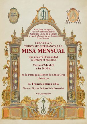 El próximo viernes 29 de Abril celebraremos la Santa Eucaristía correspondiente a dicho mes. La misa tendrá lugar en la Parroquia Mayor de Santa Cruz a las 20:30 h y estará oficiada por nuestro Párroco y Director Espiritual Don Francisco Reina Chía. Recordar a todos nuestros hermanos y fieles devotos que el horario de misa […]