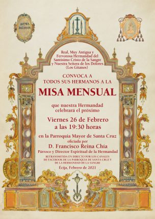 El próximo viernes 26 de Febrero celebraremos la Santa Eucaristía correspondiente a dicho mes. La misa tendrá lugar en la Parroquia Mayor de Santa Cruz a las 19:30 h y también será retrasmitida en directo por las páginas de Facebook de la Parroquia y de nuestra Hermandad. Estará oficiada por nuestro Párroco y Director Espiritual […]