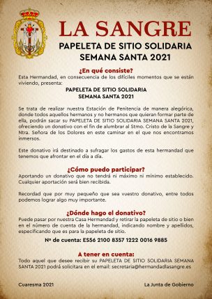 Estimado/a hermano/a en Cristo: Por la presente os informamos que nos hemos visto obligados a aplazar el Cabildo General Ordinario de Salida previsto para el día 6 de febrero de 2021, según está establecido en nuestra regla nº 66. Dicho suspensión es como consecuencia de la difícil situación que vivimos y según establece el decreto […]