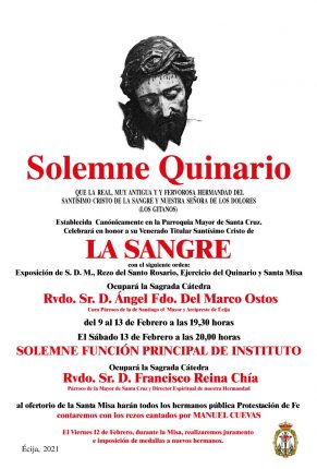 El próximo día 9 de febrero a las 19:30h dará comienzo (D.M.) el Quinario dedicado al Santísimo Cristo de la Sangre. Este año ocupará la sagrada cátedra Rvdo. Sr. Don Ángel Fdo. Del Marco Ostos, párroco de la de Santiago el Mayor y Arcipreste de Écija. El sábado 13 de febrero a las 20h celebraremos […]