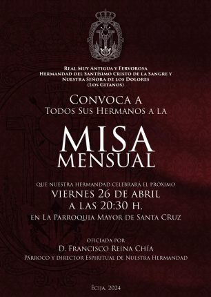 El próximo viernes, 26 de Abril de 2024 a las 20:30 horas, celebraremos D.M. la Santa Misa Mensual dedicada a nuestra Hermandad.La celebración tendrá lugar en la Parroquia Mayor de Santa Cruz y estará oficiada por Don Francisco Reina Chía.
