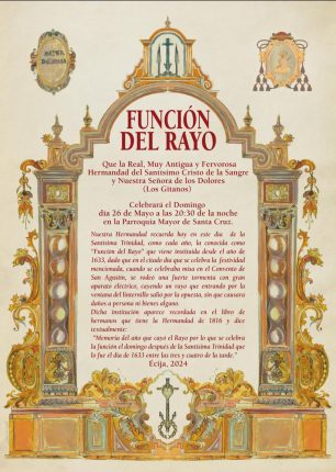El próximo domingo 26 de Mayo a partir de las 20:30h nuestra Hermandad celebra la tradicional función del Rayo. La función del Rayo consiste en la Santa Misa que se ofrece el día de la Santísima Trinidad de cada año, la cual viene impuesta por acuerdo de esta Hermandad desde el año 1625 fecha, en […]