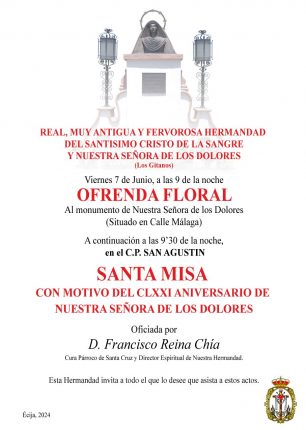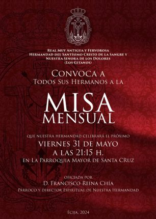 El próximo viernes, 31 de Mayo de 2024 a las 21:15 horas, celebraremos D.M. la Santa Misa Mensual dedicada a nuestra Hermandad.La celebración tendrá lugar en la Parroquia Mayor de Santa Cruz y estará oficiada por Don Francisco Reina Chía. Párroco y Director Espiritual de Nuestra Hermandad .