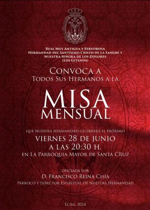 El próximo viernes, 28 de Junio de 2024 a las 20:30 horas, celebraremos D.M. la Santa Misa Mensual dedicada a nuestra Hermandad.La celebración tendrá lugar en la Parroquia Mayor de Santa Cruz y estará oficiada por Don Francisco Reina Chía. Párroco y Director Espiritual de Nuestra Hermandad .