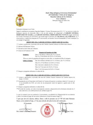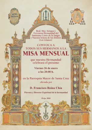 El próximo viernes, 26 de Enero de 2024 a las 20:00 horas, celebraremos D.M. la Santa Misa Mensual dedicada a nuestra Hermandad.La celebración tendrá lugar en la Parroquia Mayor de Santa Cruz y estará oficiada por Don Francisco Reina Chía.