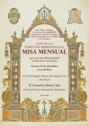El próximo viernes, 29 de Diciembre de 2023 a las 20:00 horas, celebraremos D.M. la Santa Misa Mensual dedicada a nuestra Hermandad.La celebración tendrá lugar en la Parroquia Mayor de Santa Cruz y estará oficiada por Don Francisco Reina Chía.