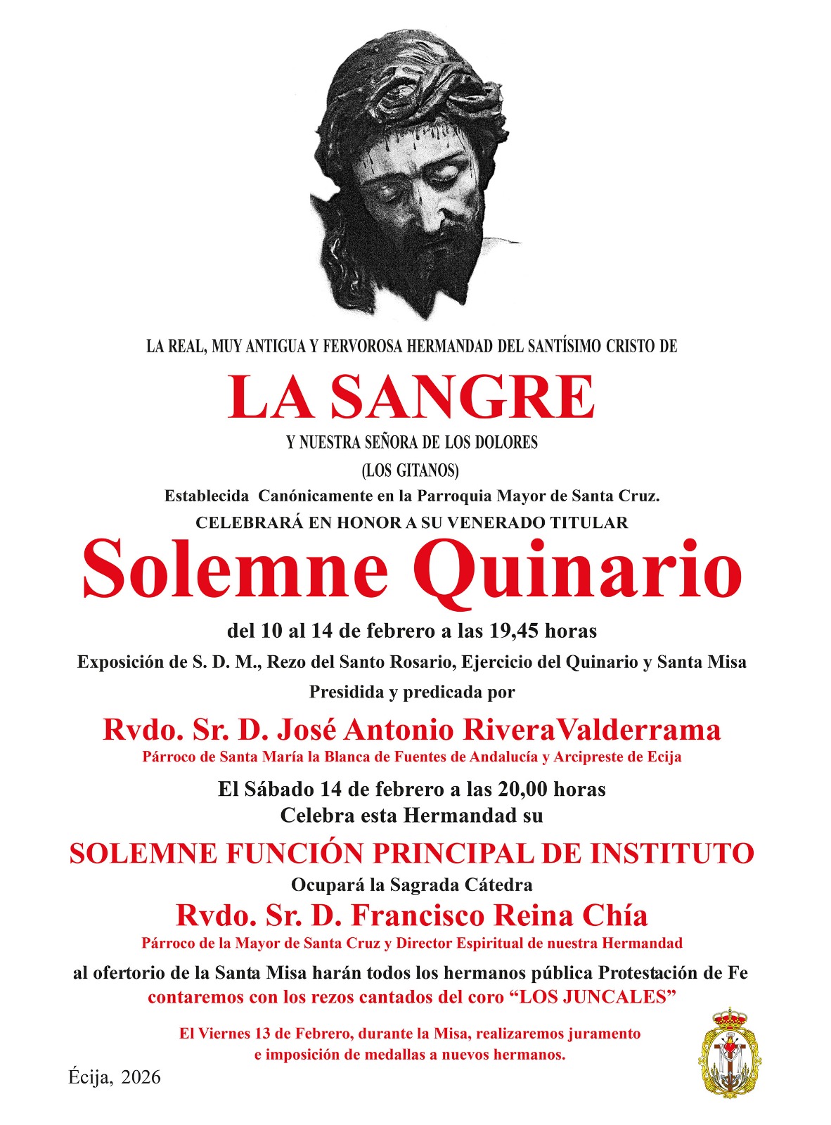 El próximo día 10 de febrero a las 19:45h dará comienzo (D.M.) el Quinario dedicado al Santísimo Cristo de la Sangre. Este año ocupará la sagrada cátedra Rvdo. Sr. Don Jose Antonio Rivera Valderrama, párroco de la de Santa Maria la Blanca de Fuentes de Andalucía y Arcipreste de Écija.